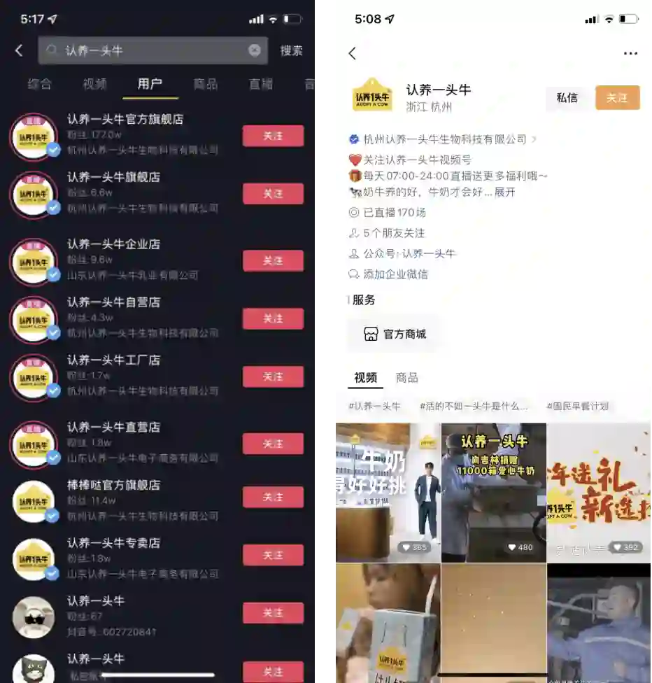 抖音:抖音账号矩阵较为庞大,目前有8个官方账号,总粉丝超过200w,主要视频内容包括产品安利、牧场介绍、品牌宣传等。8个号都会开启直播,主要以带货为主。