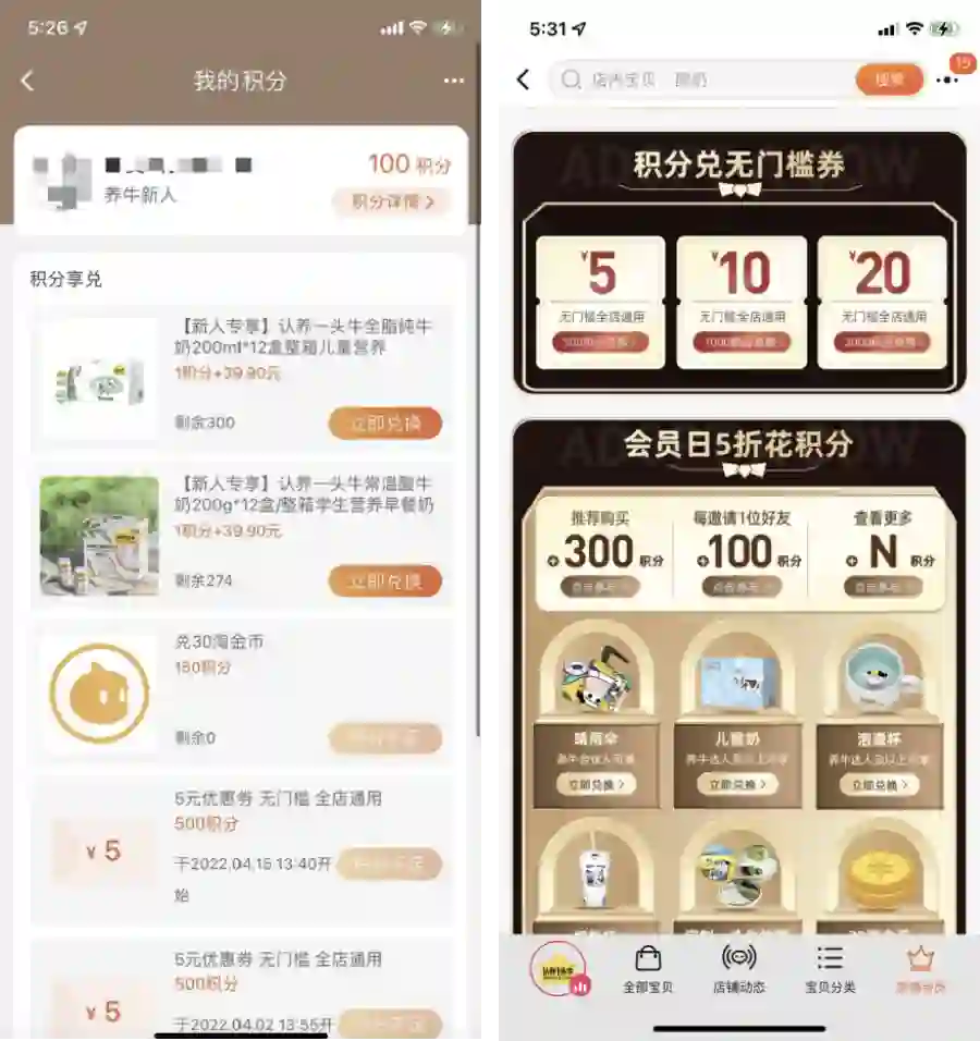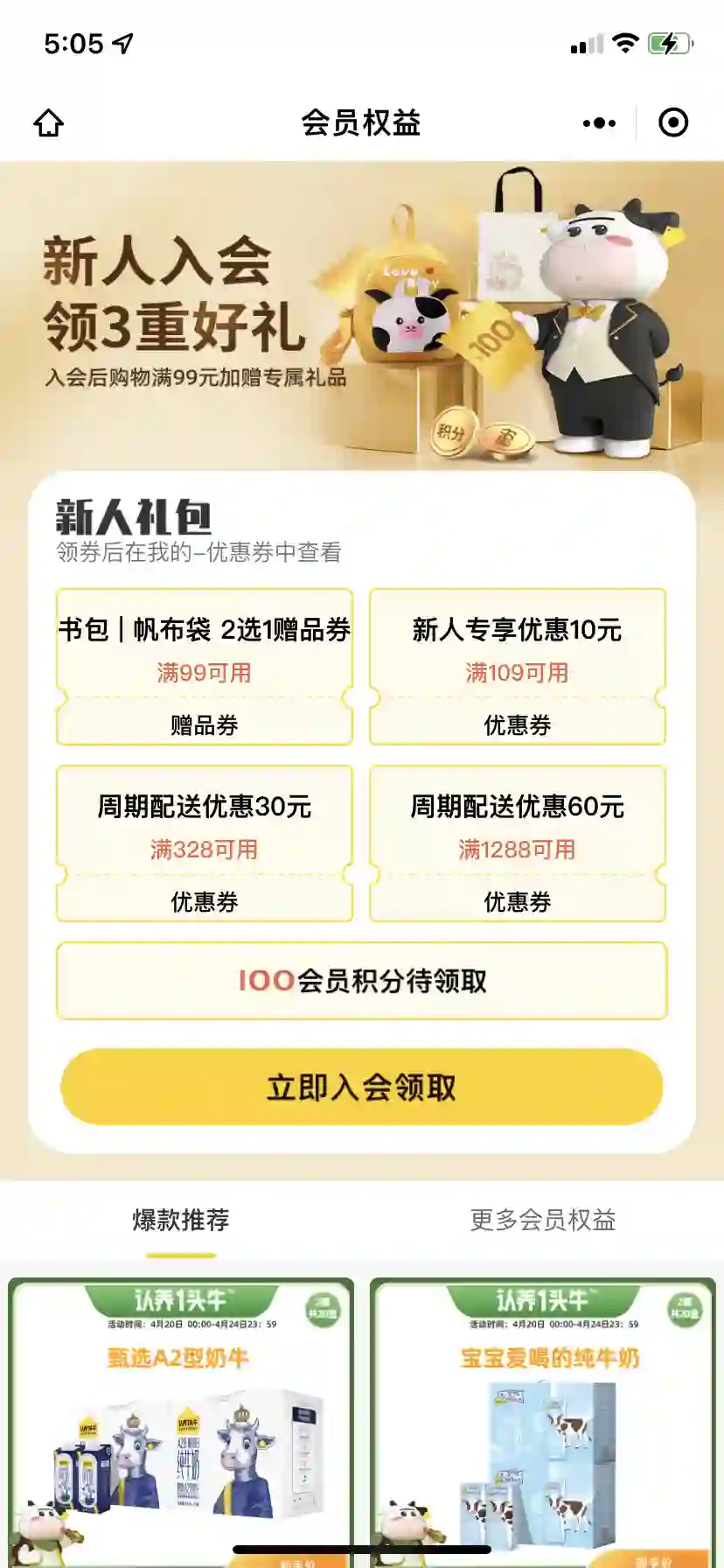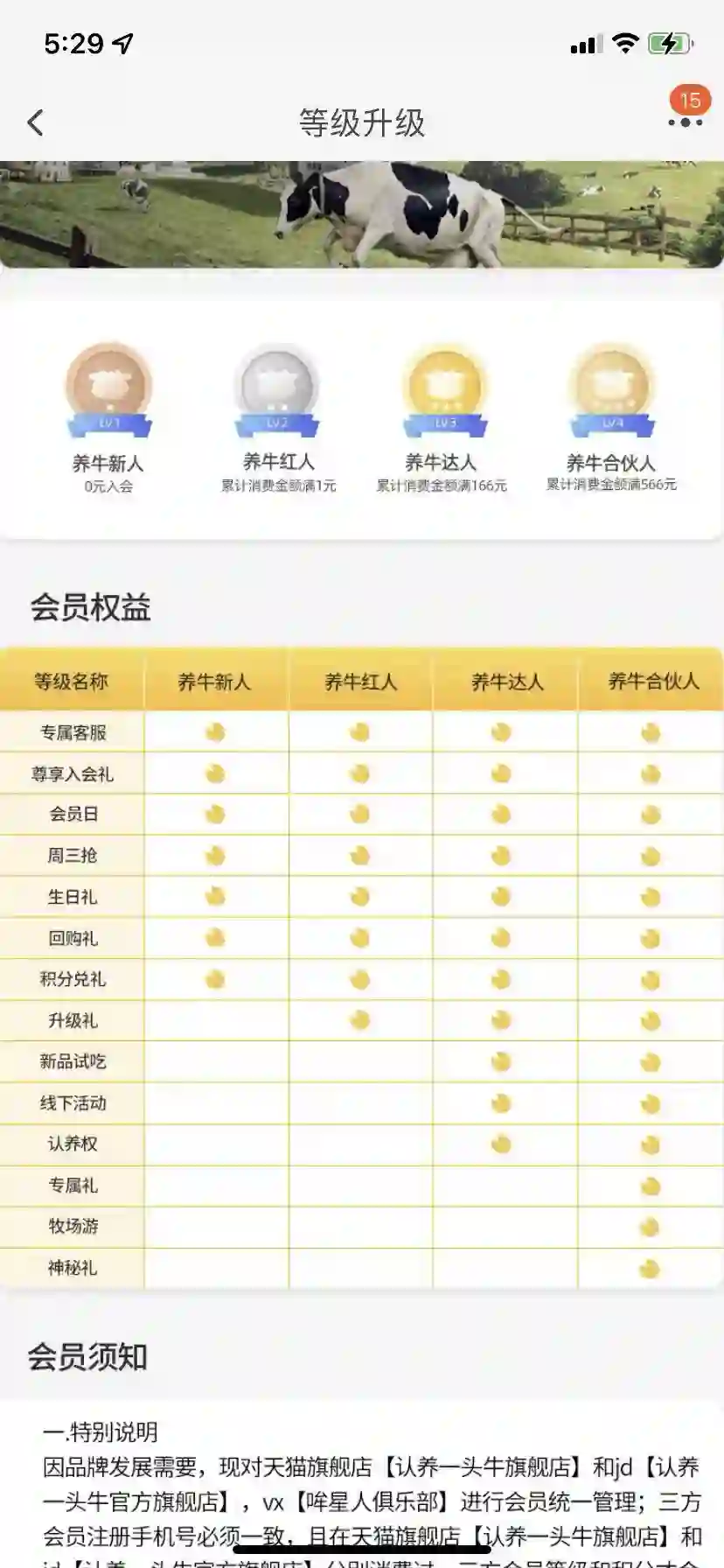 目前认养一头牛在微信小程序和电商平台中有会员的体系,两者都是成长型会员+积分的体系,福利的内容略微会有不同。