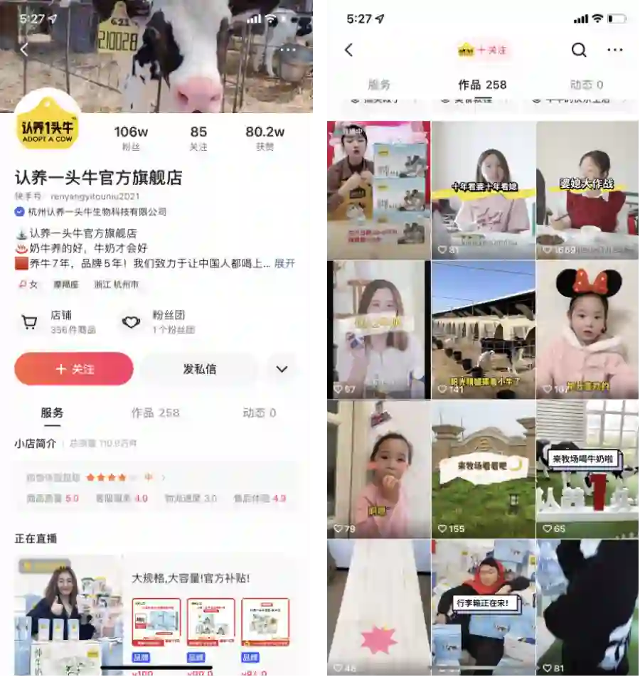 快手:目前快手上有106w粉丝,共258个作品,主要内容包括情景剧、牧场介绍、品牌宣传等,也在定期开启直播,以带货为主。
