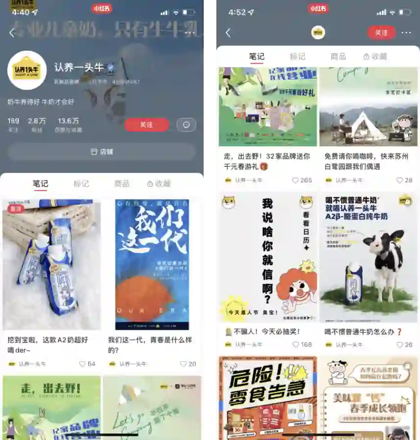 作为互联网属性的牛奶品牌,不同于传统乳企深耕多年的渠道支撑,认养一头牛在小红书、抖音、微博、B站等公域渠道以及线下都进行强力的品牌曝光和引流。