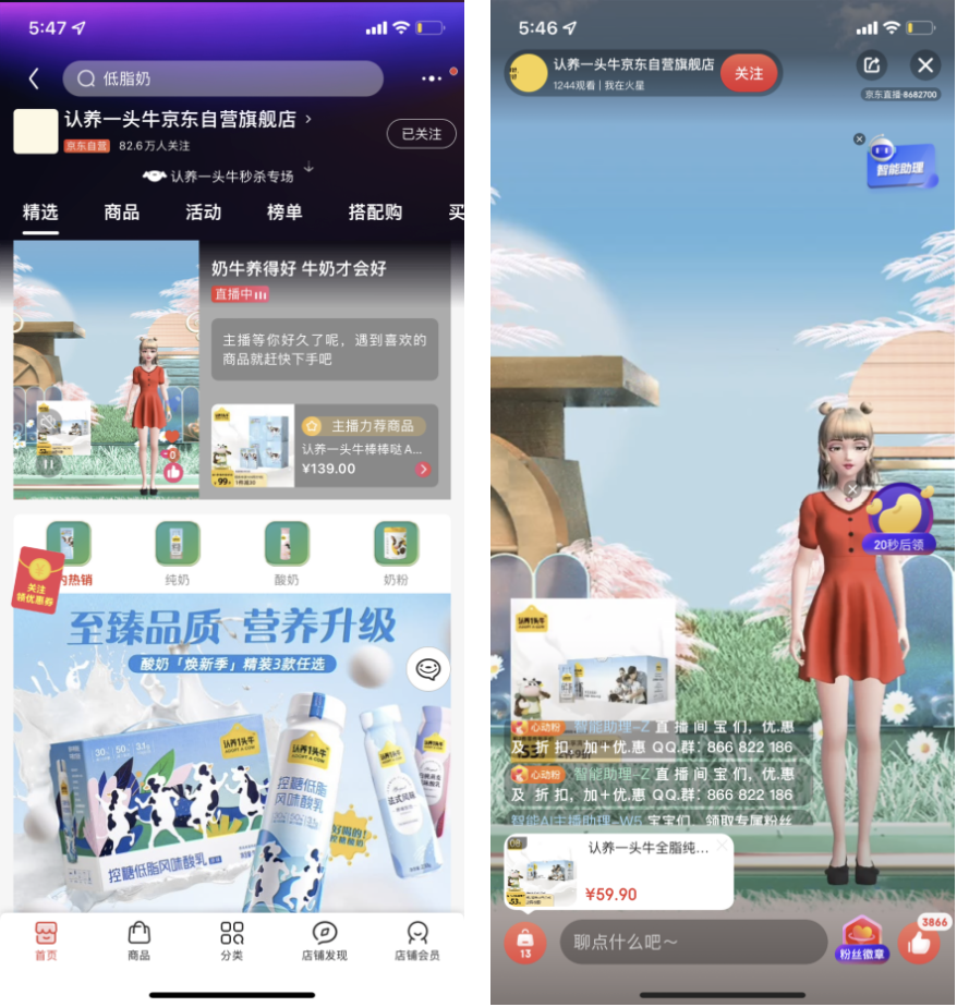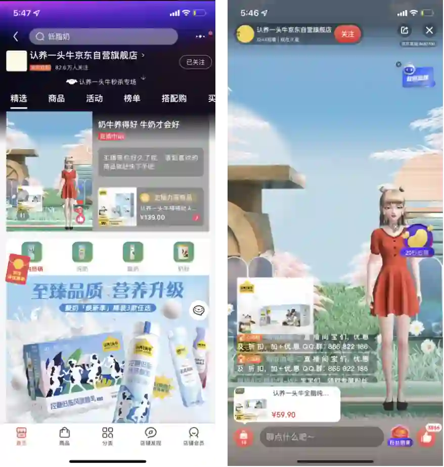 京东:京东旗舰店目前粉丝82.6w人,店铺会开启直播,采用了虚拟主播,主要也是以带货为主。