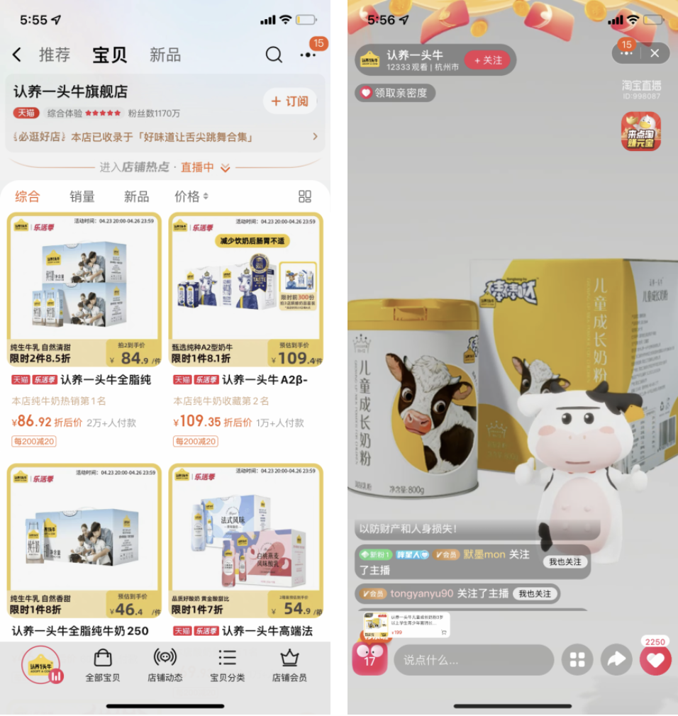 淘宝:淘宝旗舰店目前粉丝1170w,是所有渠道中粉丝量最多的,每日会进行直播,以带货为主。