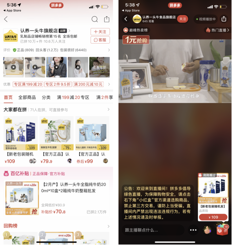 拼多多:拼多多旗舰店目前粉丝10.6w人,店铺也会开启直播,但白天时段查看时为录播,观看人数也不多。