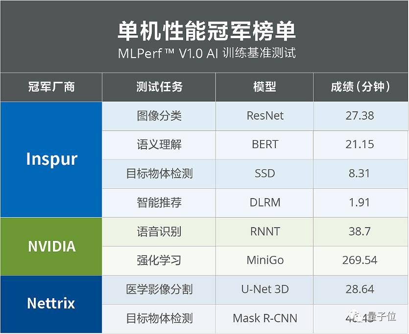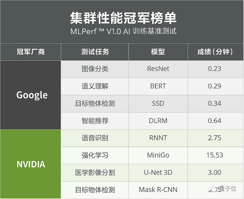 谷歌与NVIDIA在集群系统测试中展开激烈冠亚军争夺,最终谷歌获得了ResNet、SSD、BERT和DLRM四项任务的第一,NVIDIA则夺得U-Net3D、Mask R-CNN、RNN-T和MiniGo四项任务冠军,双方平分秋色。在单机系统测试中浪潮获得ResNet、SSD、BERT和DLRM四项任务的冠军,NVIDIA获得RNN-T和MiniGo两项第一,Nettrix获得U-Net3D、Mask R-CNN两项第一。