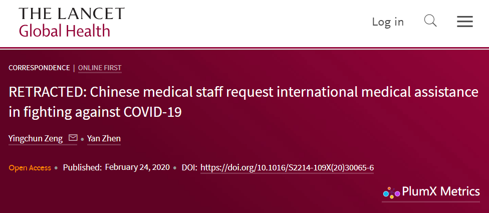 撤稿经过:该篇通讯文章发表后,有人注意到,两名作者在论文的第一段写道:“我们于 1 月 24 日到武汉…是第一批从广东来到武汉的医疗支援人员”。但问题是,第一批广东援助湖北武汉医疗队成员名单中,并没有看到这两位作者的名字。这引起广东援助湖北武汉医疗队的不满,认为作者盗用了他们的名义,并要求作者道歉和撤稿。后续,两名作者向《柳叶刀》提出撤稿申请,并在撤稿说明中表示她们的信息并不是一手的。