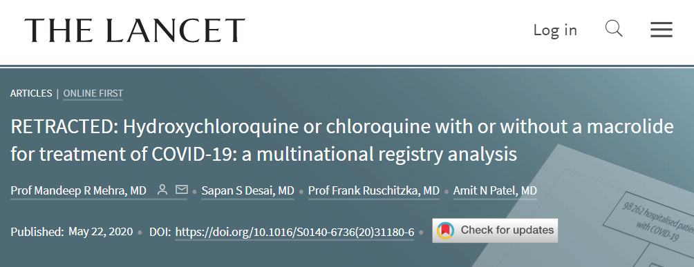 撤稿经过:文中称其数据来自一家从未听说过的,名为 Surgisphere 的数据分析公司,他们提供的数据具体细节似乎令人难以置信。且在临床上,患者服用羟氯喹的安全性一向可控。于是国际医学界开始质疑该论文“数据掺水”。而后,《柳叶刀》聘请独立调查小组交涉该神秘公司,但该公司以签署保密协议为由,拒绝交出临床数据信息来源和数据库原始资料。