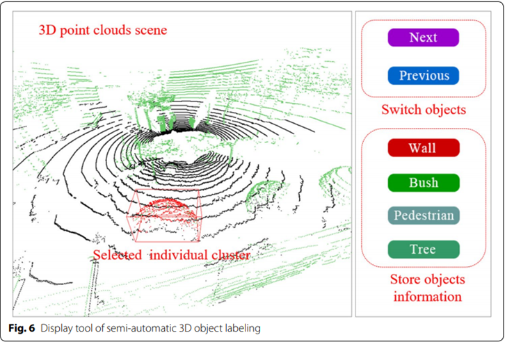 由于LiDAR生成的点云数据具有稀疏、无纹理信息的特点,为了更加准确地判定物体的种类,该团队开发了如下图所示的半自动样本标记工具,结合障碍物周围的场景信息,提升障碍物的人工标签准确率。为了提升数据库中的点云样本质量,已将存在遮挡、结构不完整的点云样本剔除,尽可能保留结构较为完整的物体点云。