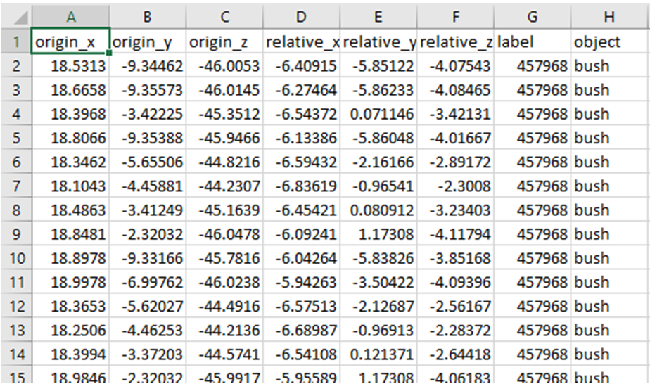 LSOOD数据集中点云样本存储在.csv文件,每个.csv文件存储了不同的物体信息,包含了物体点云的x,y,z全局坐标(origin),物体中心为原点的局部坐标(relative),以及对象标签(object)。