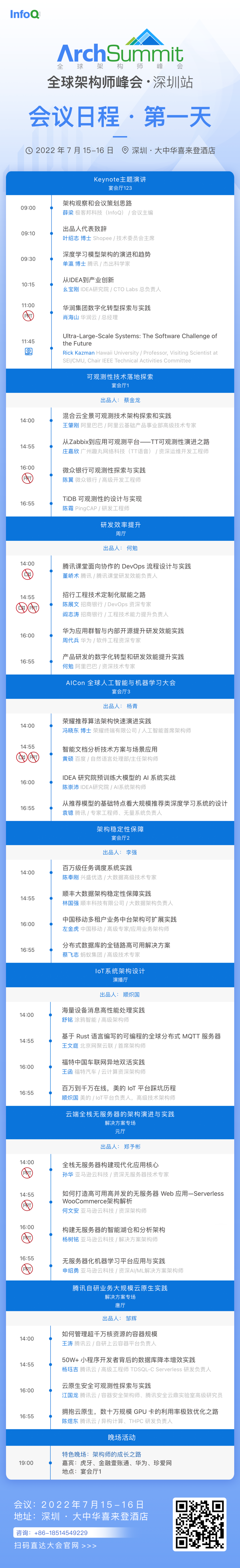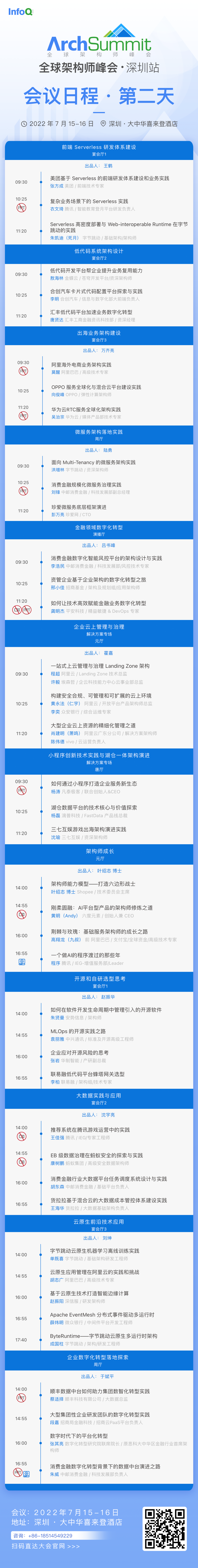ArchSummit 全球架构师峰会作为国内极具影响力的技术峰会,将于 2022 年 7 月 15 日 -7 月 16 日在深圳大中华喜来登举办。峰会围绕数字化转型的大方向来策划,包含了架构师人群最关心的架构设计话题,例如微服务架构、IoT 系统架构设计、架构稳定性设计等方向,还增加了金融数字化转型、制造业数字化转型等专题,来自国内外资深的技术专家将着重分享数字化转型过程遇到的问题,以及解决问题的经验。想了解本次峰会的更多内容可以查看下面大会完整日程图。