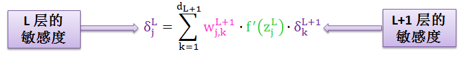 现在看公式左右两边,我们已经建立了 L 层和 L+1 层的敏感度的关系,即用“L+1 层 dL+1 个敏感度 δkL+1”来表示“L 层 1 个敏感度 δjL”。