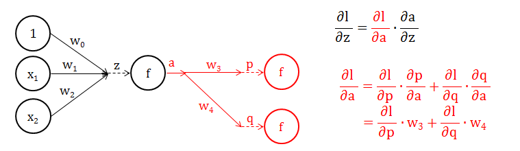 一次性得到 ∂l/∂a 的表达式真的很困难,因为从 a 开始后面每层的分数都和 a 有关,直到最后一层 l。那么我们就先只往前看一层,根据链式法则情况 2 (见小节1.8) 轻松得到上图的红色公式。