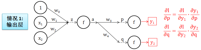 情况 1:如果到了输出层,我们就到头了,因为 ∂l/∂p 可以显性写出。而这是因为 ∂l/∂y1 可以显性写出 (试想损失函数 l 是 y 的平方差函数),也因为 ∂y1/∂p 可以显性写出 (y1 是分数 p 经过转换函数 f 加工出来)。上述所有推理对 ∂l/∂q 也适用。如下图所示: