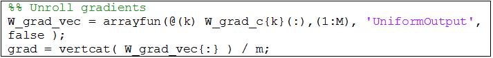 其中 arrayfun 是将“元胞数组变成向量”这个操作应用在每个 W_grad_c 的元素上,由于该操作的 output 是大小不同的 array,因此'UniformOutput'应该设为 false。