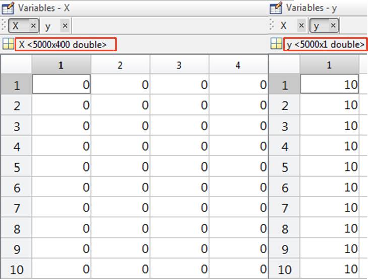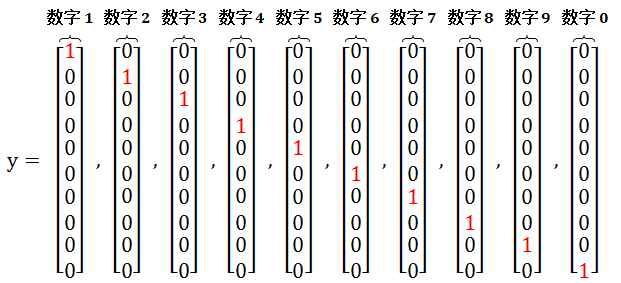 用列向量 y 代表整个数据集的标示 (label),用 1 到 9 来标记“数字 1 到 9”,用 10 来“标记数字 0”。每一个示例的表示是 y 的一个,那么 y 的大小是 5000×1