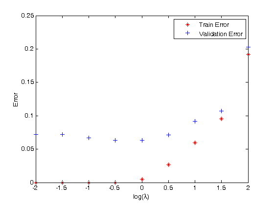 为了选择最优 λ,我们将 5000 个数据集随机分成 4 比 1,4000 个用做训练调权重,1000 个用作验证选 λ,给定一组 λ = {10-2, 10-1.5, 10-1 …,10, 101.5, 102},画出训练误差和测试误差: