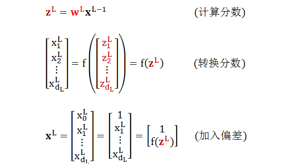 L-1 层的输出信号 xL-1 乘以权重 wL 得到分数 zL