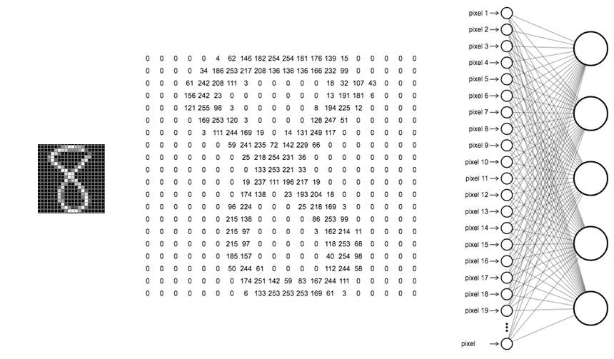 下图展示如何将数字 8 的照片分解成 400 个像素,并将这 400 个像素对应的灰色强度值作为神经网络的输入层上的 400 个节点。