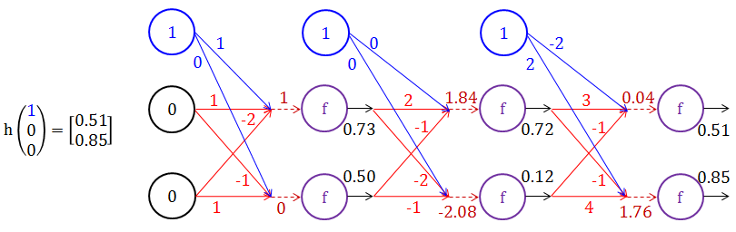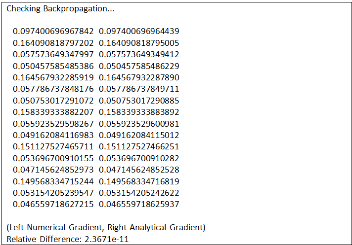 代价函数值 J 是由正向传播算出,而梯度 grad 是由反向传播算出。在接下来两小节,我们先不考虑正规项的惩罚系数 lambda 的问题,或先简单认为它等于 0。