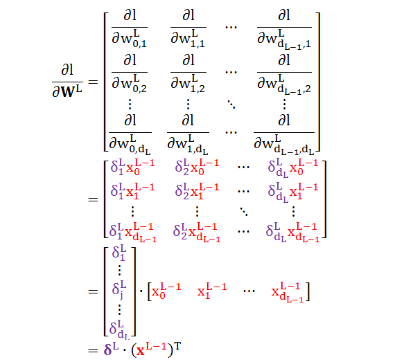 有了 δ 矩阵形式,根据 ∂l/∂WL 的定义和公式 1 有