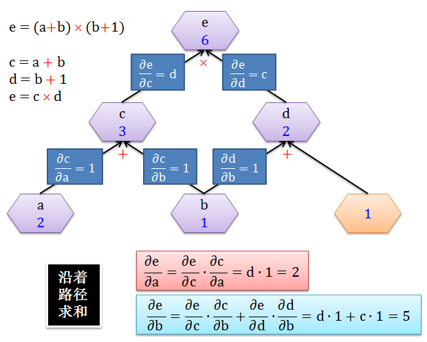 因此 ∂e/∂b = ∂e/∂c × ∂c/∂b + ∂e/∂d × ∂d/∂b = 2 + 3 = 5