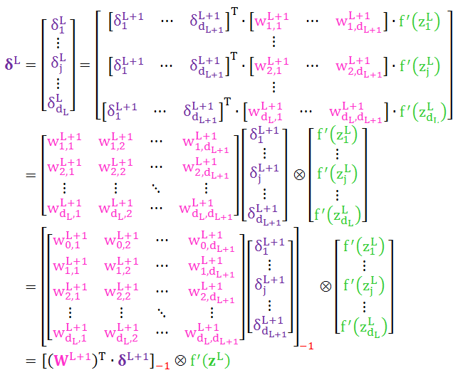 其中第二行根据 zkL+1 的表达式,第三行根据 δkL+1 的定义,第四行用累加符号简化表达式。