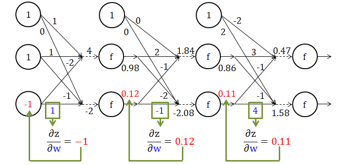 当 a = 2, b = 1 时,从下往上 (黑色箭头) 的计算出 c = 3, d = 2 以及 e = 6。整个过程就是正向传播 (forward propagation),顾名思义就是沿着正方向做一些计算。