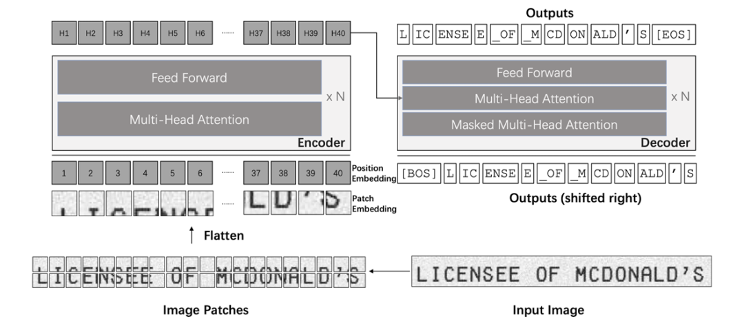 TrOCR 采用了 Transformer 结构,包括图像 Transformer 和文本 Transformer,分别用于提取视觉特征和建模语言模型,并且采用了标准的 Transformer 编码器-解码器模式。编码器用于获取图像切片的特征;解码器用于生成 wordpiece 序列,同时关注编码器的输出和之前生成的 wordpiece。