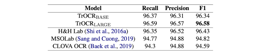 表3: 大规模预训练的 TrOCR 模型在 SROIE 印刷体数据集的实验结果