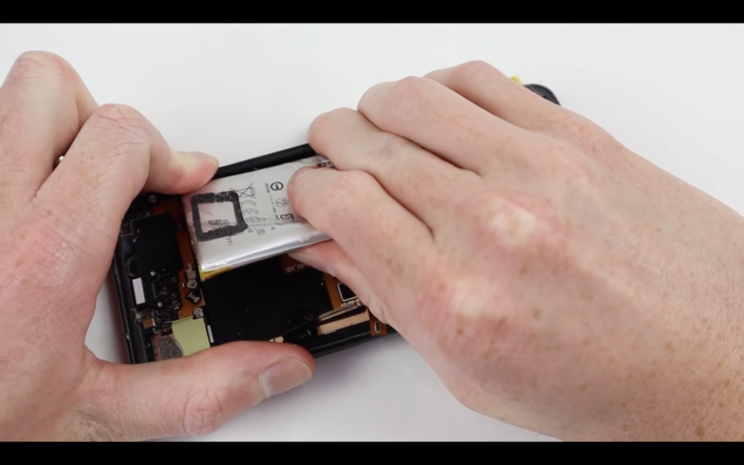 问题在于,谷歌并没有给电池易拉胶留出足够的水平空间,导致胶带要么无法竖向抽出、要么会因为倾斜着刮在中框金属上而直接扯断。苹果从 iPhone 5S 开始使用的抽拉式易拉胶,虽然没有在内部结构上直接留出空间,但是在拆卸掉 Taptic Engine 和主板之后可以无损地将电池抽出;谷歌则是反其道而行之,在 Pixel 3 上将电池易拉胶放在了无论怎么拆都会被中框挡住的左侧,也就导致了扯断易拉胶几乎是无可避免的事情,即使是经验丰富的 Hugh Jeffreys 最后也是手动把电池掰出来的。