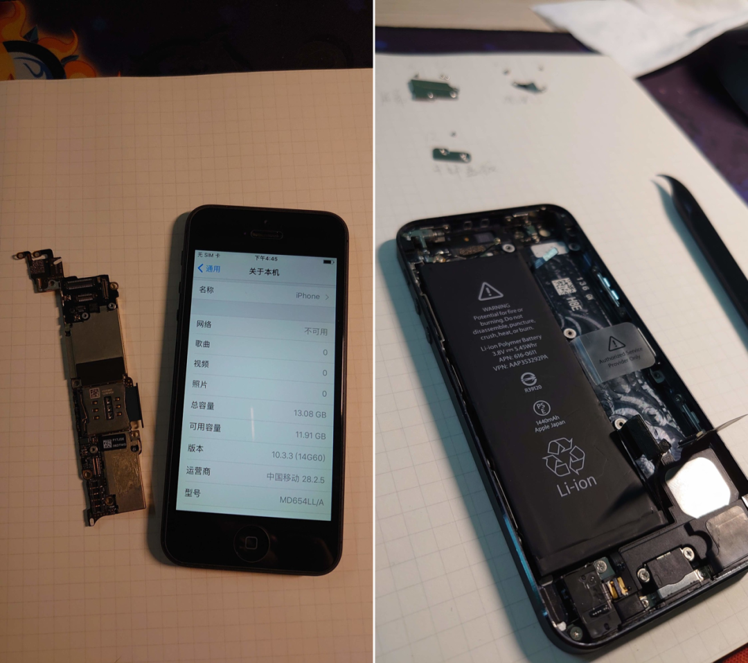 整个计划却被我一拖再拖,以至于到了 2020 年才真正着手实施。更换的过程实际上非常简单——从闲鱼上花 190 块钱买了一台 16G 的双网 iPhone 5、把手机拆开、把 16G 的主板卸下来、把我的 32G 主板装进去,完工。由于不涉及到拆换电池或者更换其他的零件,完整的「换芯」流程并没有超过二十分钟。