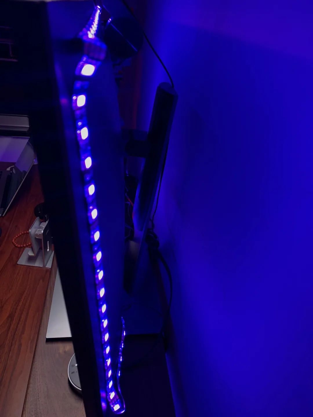屏幕背面和桌子边缘的 RGB LED 灯带沟通购置于某宝杂牌店铺,USB 供电,支持蓝牙连接在手机端 app 进行发光模式/颜色/亮度的调整。