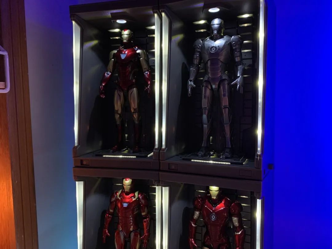 国货之光——中动的钢铁侠,分别是 MK-2(刚刚新出的,也是个人最喜欢的一款,可能由于尺寸的原因,机体上的钮钉孔稍微有点大),MK-3(线上火起来的应该就是这款了),MK-46(胸口的方舟是印刷的,4 款里面最不推荐购买),MK85(配件有点少,但考虑到身体比例还是 OK 的,所以也还不错),分别配上格纳库(可以上下左右连接)放在桌面左侧插线盒上面。四款的身体比例也是做得很不错的,但考虑到价格和尺寸的原因,摆放可以,但把玩的话,还是差一点。