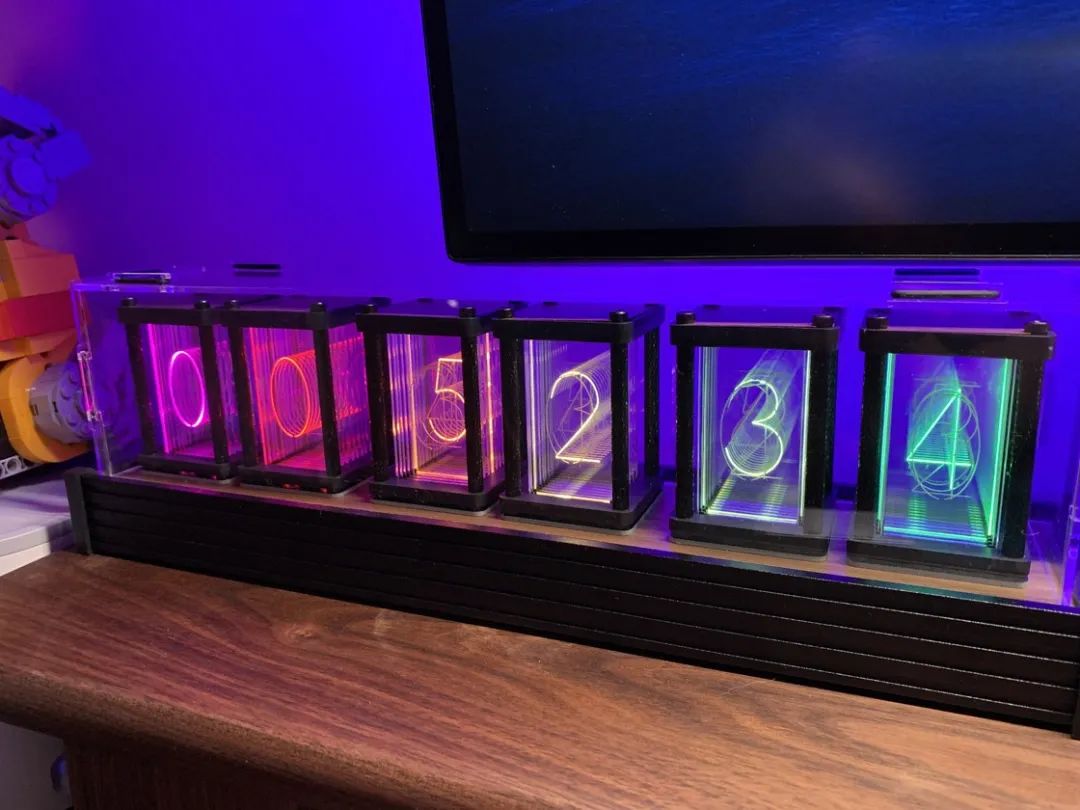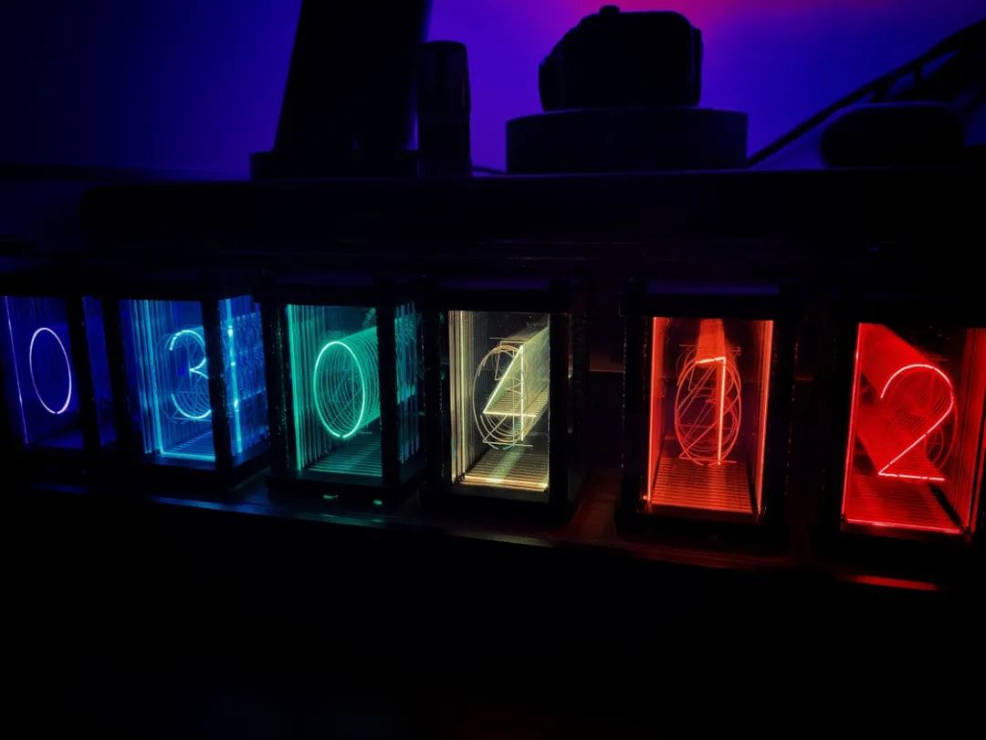 在瞎逛某宝的时候看到的,并不是辉光灯管(感觉辉光灯管还是有点门道的),而是通过 LED + 多层刻字亚克力板实现发光和数字变化的,觉得蛮好的所以就买了一个,用了大概 1.5 小时拼装好(拼装难度不高)。有 6 种颜色变化模式可供选择,通过右侧底部三个按钮进行调整。