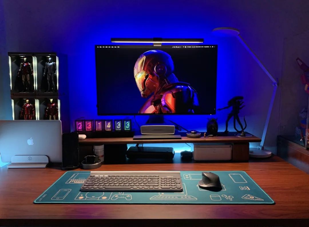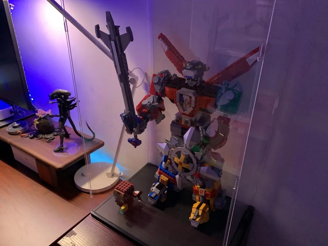 通过这次桌面的打造还为之前无处安放的 LEGO 百兽王和 Q 版钢铁侠 MK50 找到一个绝佳的位置(桌面右侧的储物柜上面),加上新购买的展示箱,放在房间中,有一种鱼缸的感觉。