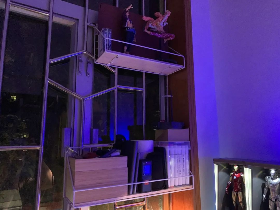 窗户的防盗网上,加装了两个置物架,下层放置一些小工具,上次放置烟弹,笔记本套和手办。后期随着陆续需要把手办陈列出来,可能会在显示器背面的墙壁上再动动工。