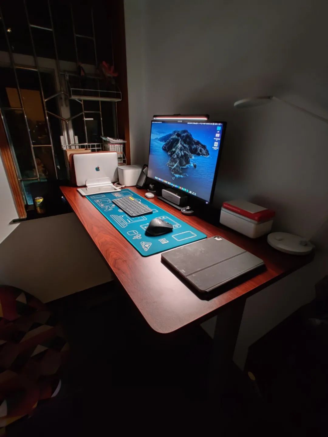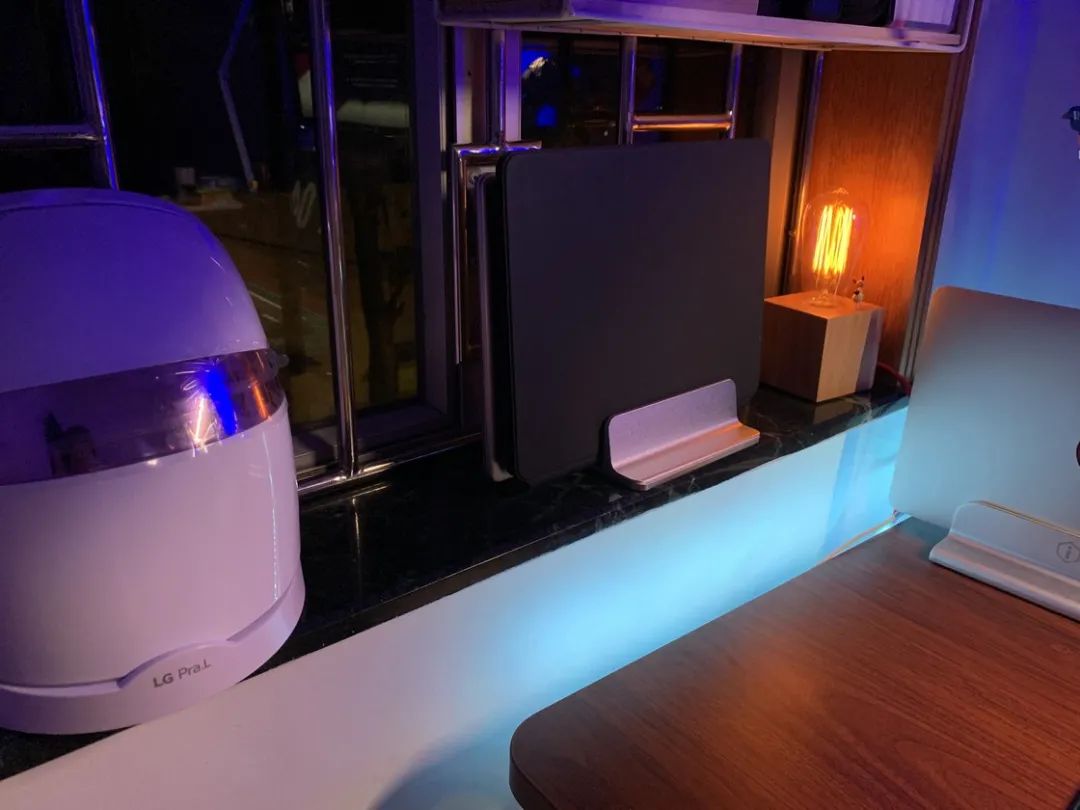 利用桌子左边窗台的位置进行延展,把时不时会挪动到显示屏下面使用的 iPad Pro连着收纳支架放置在这里,方便桌面的单屏跟双屏(使用随航功能)的切换。另外放置了一个大号的钨丝小台灯在角落增加氛围感,另一边放置了每天一用的 LG Pra.L 美容面罩[老(zao)了(shuai)才知道需要护肤,能够坚持使用确实有用]。