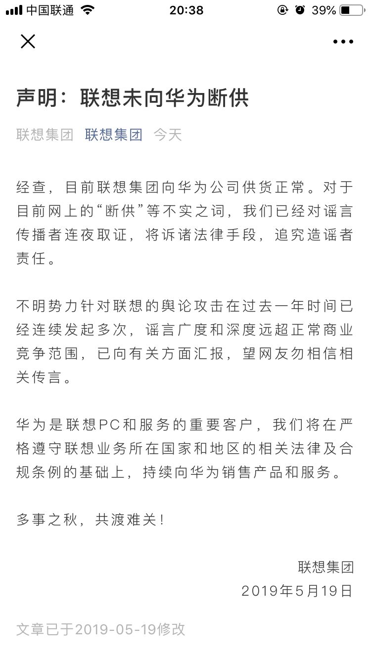 今日上午,联想集团官方公众号发布声明进行了辟谣。联想集团声明表示,目前联想集团向华为公司供货正常。对于目前网上的“断供”等不实之词,我们已经对谣言传播者连夜取证,将诉诸法律手段,追究造谣者责任。