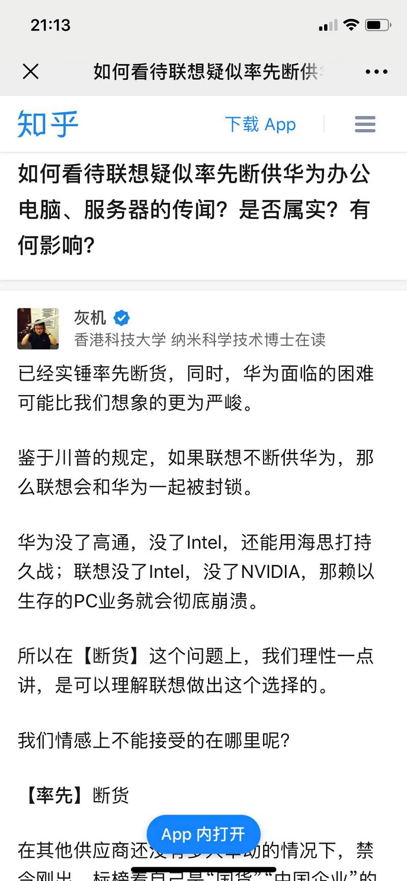 此前有消息称联想率先断供华为办公电脑、服务器,该博主在知乎发表言论并在网络上迅速发酵。