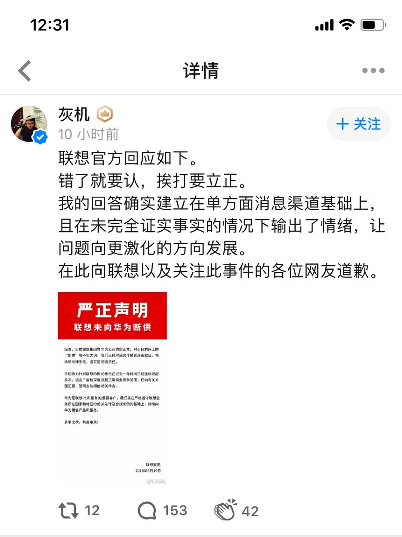 5月19日,知乎认证为“香港科技大学、纳米科学技术博士在读”发文对此前“联想断供华为”言论认错,“ 没有做到的是相互确认消息来源,且进行耐心冷静的等待,而直接在气血上涌的不理智情绪影响下,分别在对应知乎问题内回答了情绪化的极端内容,而且信誓旦旦以‘实锤’’确凿证据‘’已经证实‘的词汇增加自己答案的可信度。”