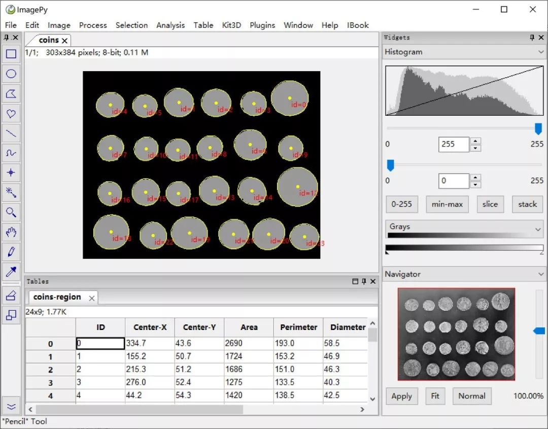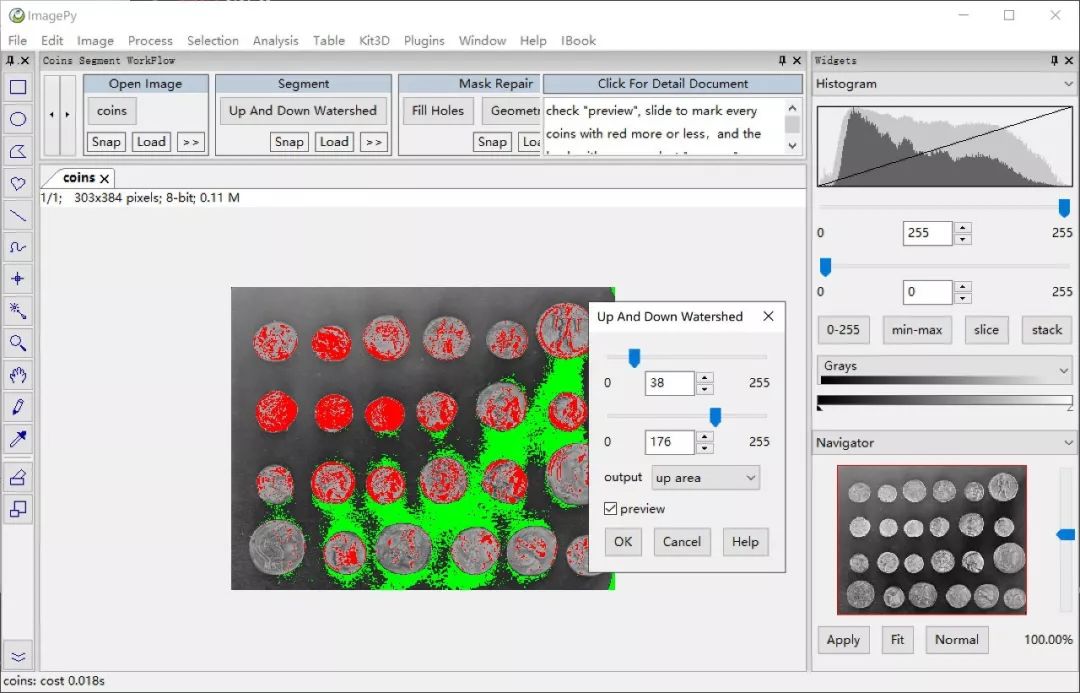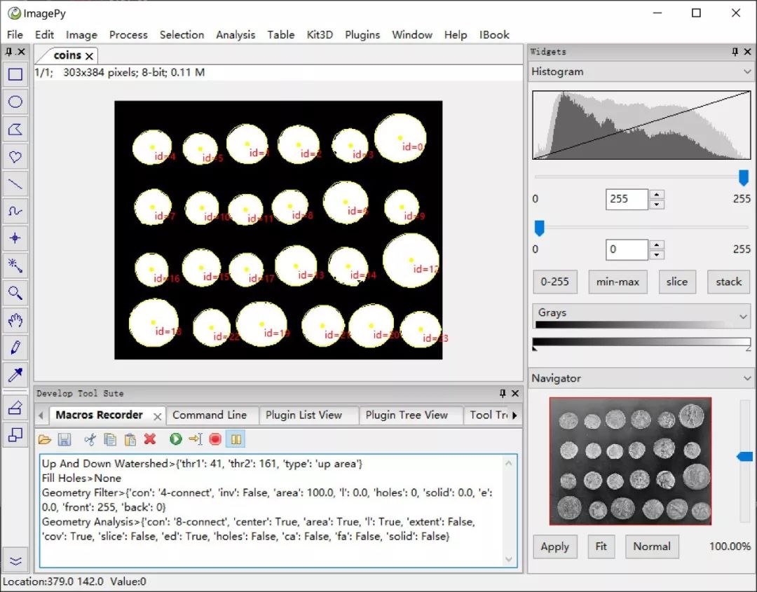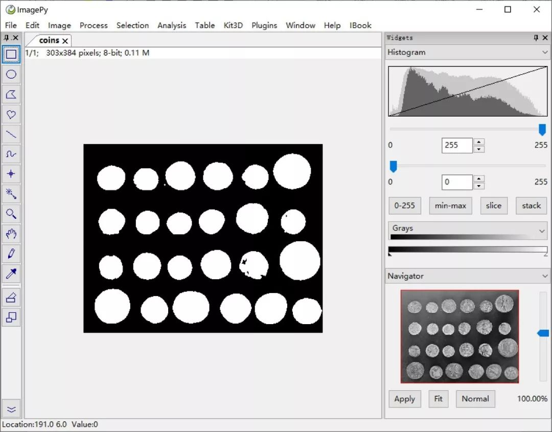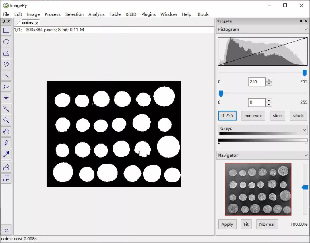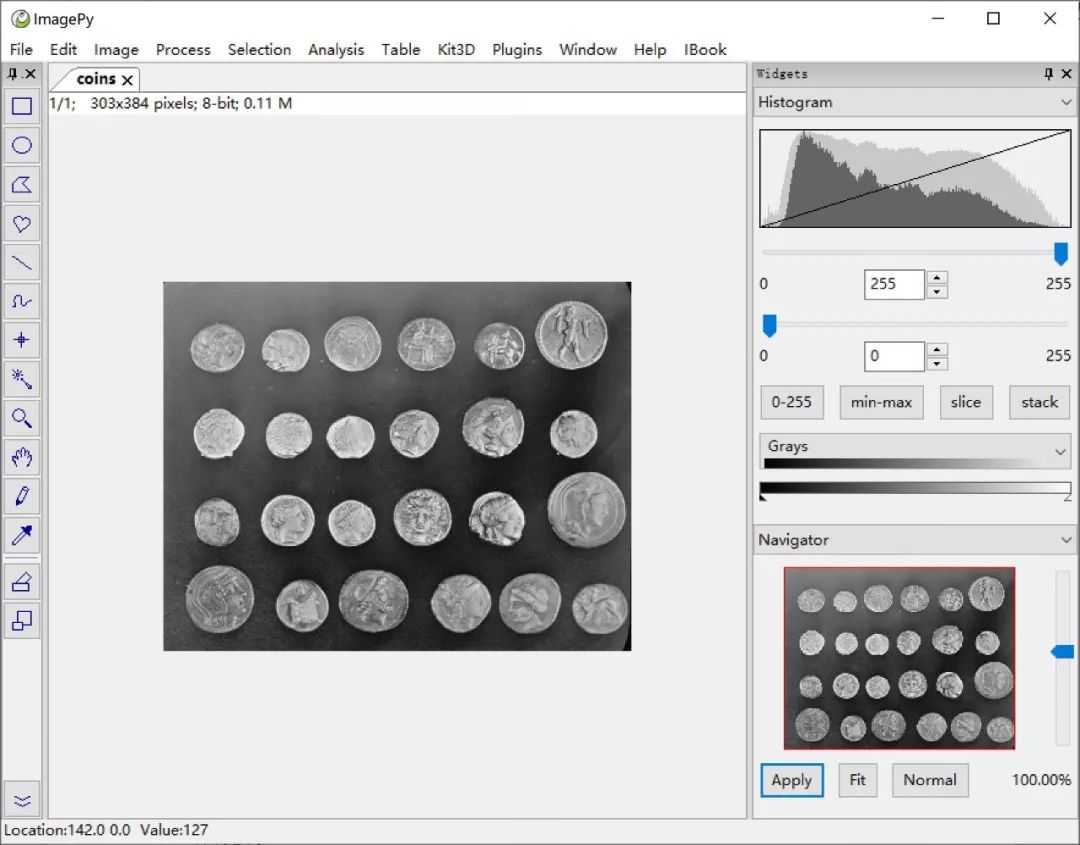 菜单:File > Local Samples > Coins,打开ImagePy的内置示例图像。ImagePy支持bmp, jpg, png, gif, tif等常见图像类型,支持xls, xlsx,csv表格格式,通过ITK插件,也可以获得dicom,nii等医学数据格式的读取存储功能,而通过OpenCV插件,可以获得wmv,avi等视频格式的读取存储功能。