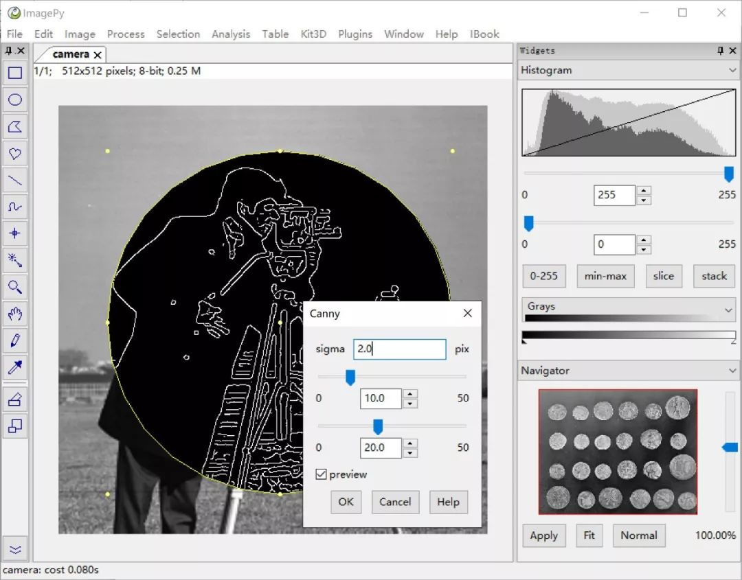 以上我们介绍了宏和工作流,利用宏和工作流可以串联已有的功能,但不能制造新的功能,而这里我们试图为ImagePy添加一个新功能。ImagePy可以方便的接入任何基于Numpy的函数,我们以scikit-image的Canny算子为例。