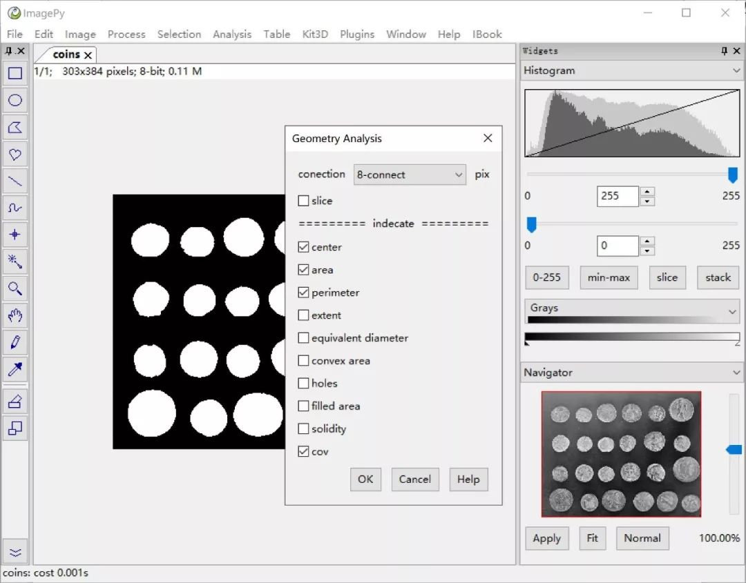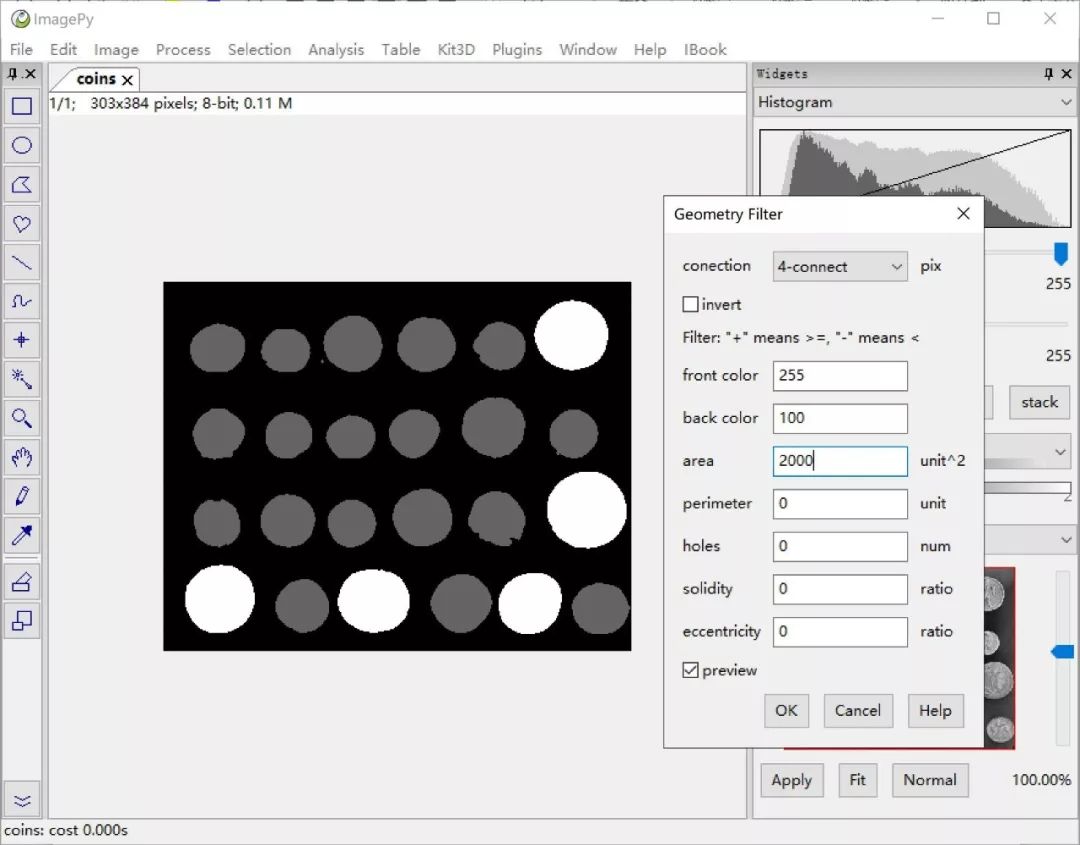 菜单:Analysis > Region Analysis > Geometry Filter,对区域进行过滤,这里可以简单的通过面积进行过滤,ImagePy的几何过滤可以通过面积,周长,拓扑,丰满度,偏心率等指标对区域进行过滤,可以输入复合条件,正数表示选择大于等于,负数表示选择小于,通过过滤的被设定为front color,没通过的设定为back color,back color设定为100可以清楚看到有哪些被滤掉了,如果确认符合要求,back color设定为0,即清除。同时ImagePy也支持灰度密度过滤,颜色过滤,色彩聚类等功能。