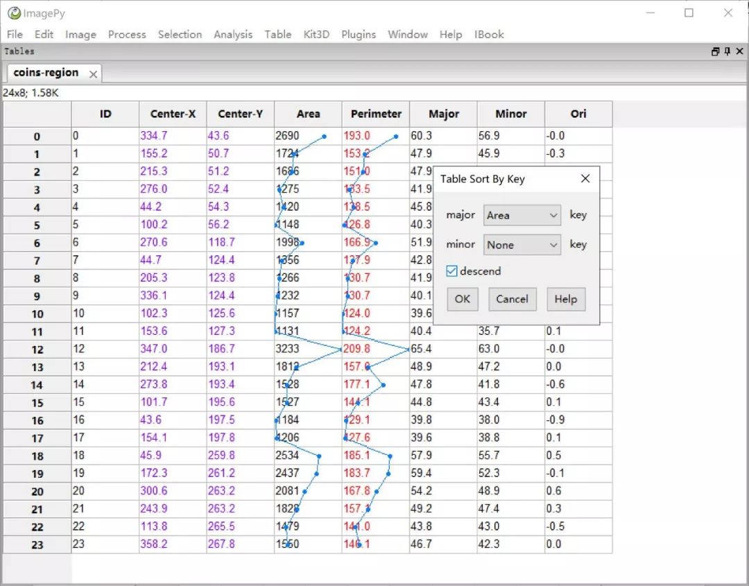 菜单:Table > Statistic > Table Sort By Key,选择第一主键为area,勾上descend,即按照面积降序排列。表格是图像之外的另外一种重要的数据,某种意义上,很多时候我们都需要在图像上得到需要的信息后,以表格的形式对数据进行后期加工。ImagePy支持表格筛选,截取,统计,排序等功能。