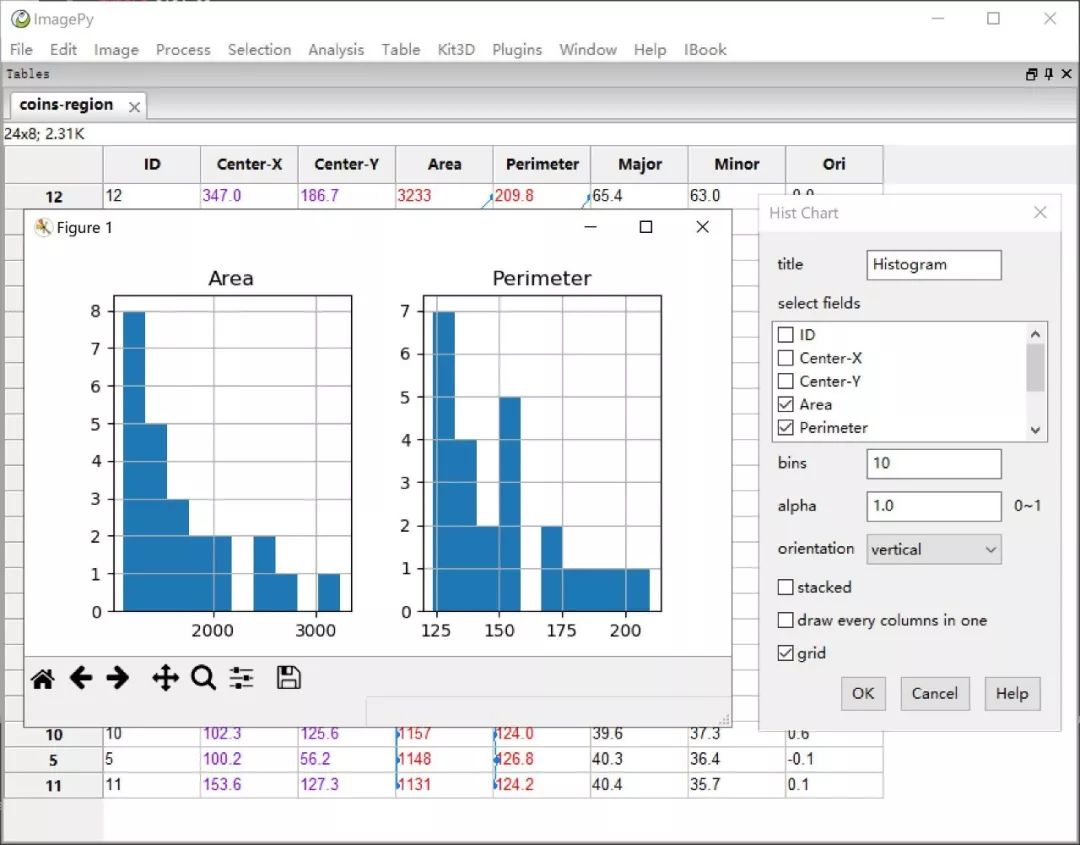 菜单:Table > Chart > Hist Chart,表格数据一个常见的需求是绘制图表,这里我们对面积,周长两列进行直方图统计,得到分布直方图。ImagePy的表格可以绘制折线图,饼状图,柱状图,散点图等常见的图表。图表自带缩放,移动等功能,也可以存储为图片。