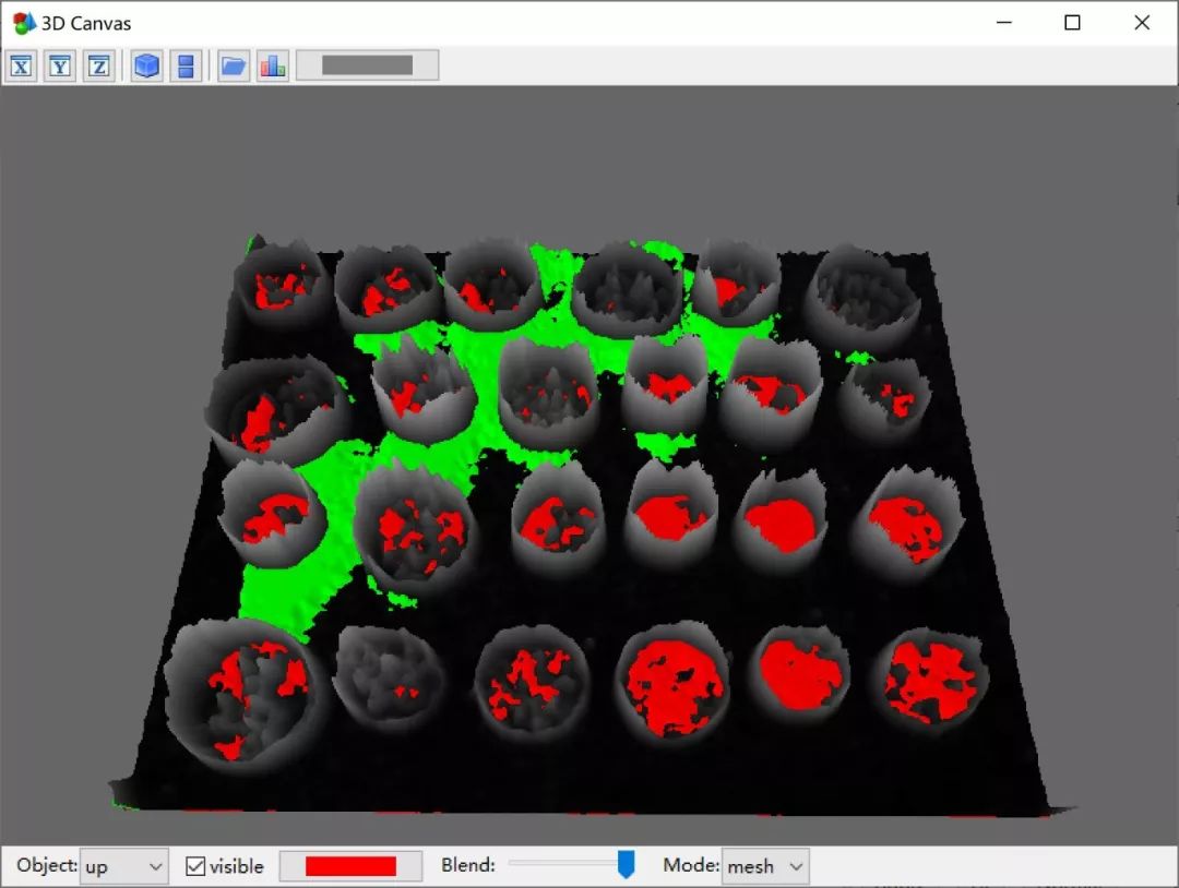 菜单:Kit3D > Viewer 3D > 2D Surface,对图像进行表面重建,这里其实是分别重建了sobel梯度图,高阈值,低阈值三个结果。图上可以清楚的看懂Up And DownWatershed的工作原理,首先计算梯度,然后通过高低阈值标记硬币和背景,最终在dem图上模拟涨水,形成分割。ImagePy可以做图像的三维滤波,三维骨架,三维拓扑分析,也可以对数据进行二维表面重建,以及三维表面可视化。三维视图中可以自由拖动,旋转视角,图片结果也可以输出为stl文件。