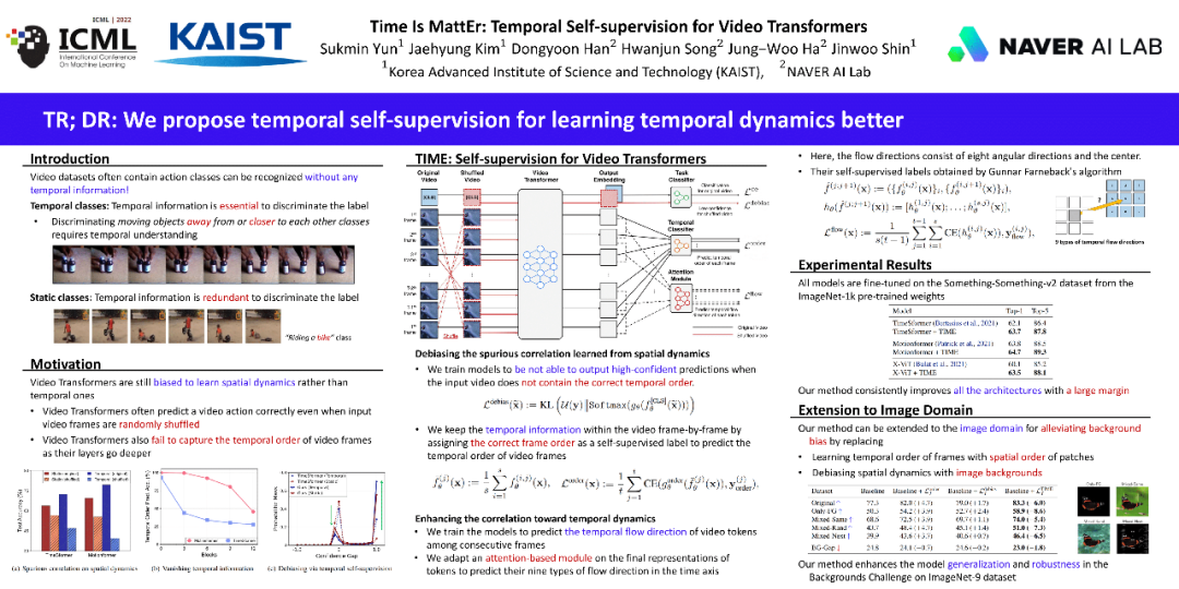 理解视频的时间动态是学习更好的视频表现的一个重要方面。最近,基于transformer的架构设计在视频任务中得到了广泛的探索,因为它们能够捕获输入序列的长期依赖性。然而,我们发现这些视频transformer在学习空间动力学而不是时间动力学时仍然是有偏的,去偏伪相关对它们的性能至关重要。基于观察结果,我们为视频模型设计了简单而有效的自监督任务,以更好地学习时间动态。具体来说,为了消除空间偏差,我们的方法学习视频帧的时间顺序作为额外的自监督,并强制随机洗牌的帧具有低置信输出。此外,我们的方法学习连续帧之间视频标记的时间流方向,以增强与时间动态的相关性。在各种视频动作识别任务下,我们证明了我们的方法的有效性,以及它与最先进的视频transformer的兼容性。