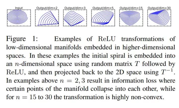 对于一个M维的数据,我们可以将其看成是在M维空间中的一个M维流形(manifold)。而其中的有用信息,就是在该M维空间中的一个子空间(子空间的维度记为N维,N<=M)中的一个N维流形。非线性激活层相当于压缩了这个M维空间的维度(还记得前面提过的维度压缩吗?)。若是该M维空间中的M维流形本来就不含有冗余信息(M=N),那么再对其进行维度压缩,必然导致信息的丢失。