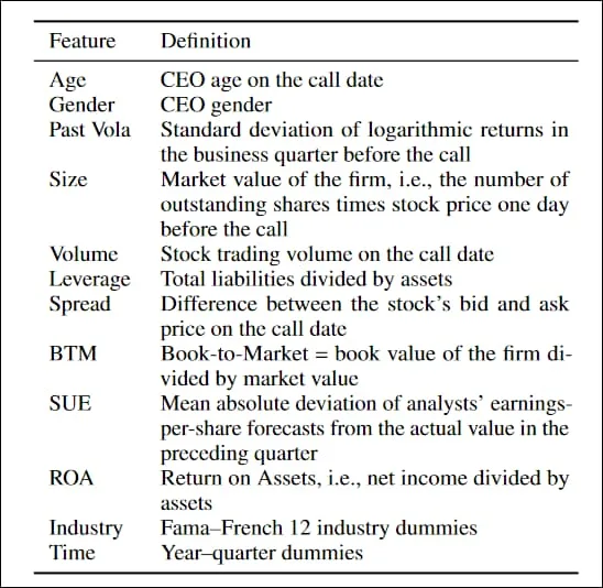 为了识别和描述 CEO的言论,研究人员使用了来自路透社Refinitiv EIKON数据集的 88000 份财报电话会议记录,并以编程方式将指定的 CEO 按年龄和性别数据进行匹配。 为了获得个性标签,研究人员使用了个性数据库,这是一个用户贡献的个性评估众包平台,提供了 32 位大公司CEO(包括乔布斯和马斯克)的足够个性数据。为了验证估计,研究人员在基于人群的 MBTI 和 Big 5 模型投票之间构建了相关矩阵,用于数据中确定的所有对应人物。结果发现,这两个模型下对评估数据的结果高度一致。研究测试了 BERT ( base )、RoBERTa ( base ) 和支持向量机 (SVM)等多个模型 ,。训练后,发现 RoBERTa 表现最好。在下图中,我们看到了模型对马斯克个性的各种估计:为了促进项目的风险回归,作者研究人员又将CEO的财报电话会议言论数据与来自 IBES、CRSP 和 Compustat Execucomp 的数据库进行了合并。为了在 CEO 发表言论后预测股价变化,研究人员结合了先前工作中的各种风险agent,还结合了年龄和性别,以评估可能带来的多重影响。下面是CEO言论——企业风险模型的指标列表及其定义。本模型中的对企业风险的评估指标