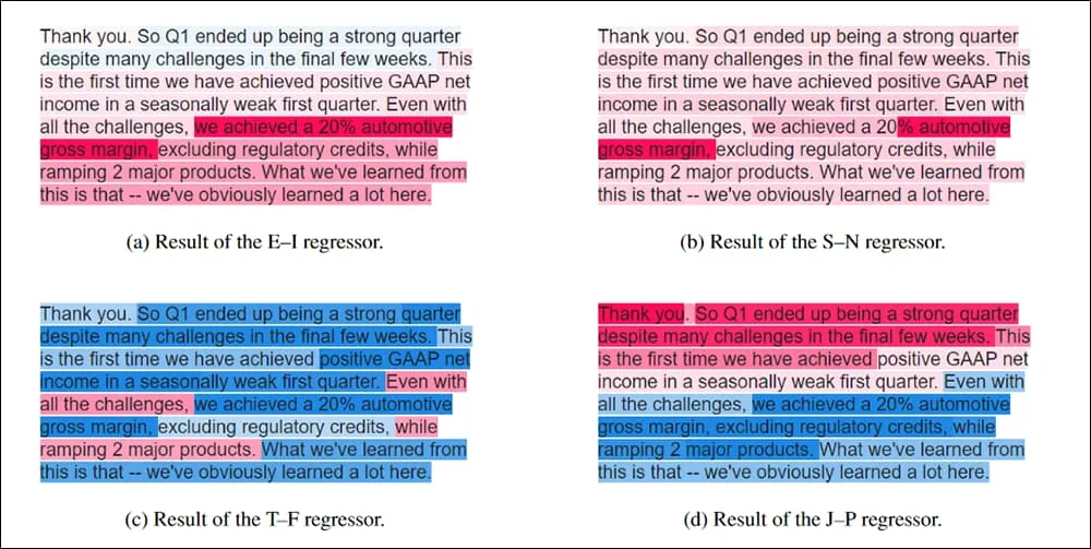 论文链接:https://arxiv.org/pdf/2201.07670.pdfMBTI模型将人格分为ENTJ四种类型(即外向、感觉、思考、判断)。在过去的十年中,ENTJ已经成为社交媒体上流行的自我分析工具。 在这个模型中有四个轴,分别代表:外向与内向(EI);感知与直觉(SN);思考与感觉(TF);和判断与感知(JP)。该论文的作者使用众包数据创建了全球著名企业 CEO 的 MBTI 档案,并建立了一个单独的数据集和架构,能够成功地预测 CEO 性格对公司股价的影响。该架构使用 Elon Musk 作为中心测试对象。一些著名大公司的CEO及其人格类型划分这项新研究根据对大企业CEO的性格(特别是他们在公开场合的言论)的估计,建立了一种客观的股价预测方法。首先,作者提出了CEO个性与公司绩效的相关性。作者指出:「在风险回归任务中,我们表明预测的 CEO 性格与股票收益波动形式的财务风险显著相关。定性地讲,外向、直觉和思考类型的 CEO ,投资其公司股票面临的经济风险较低。」接着,研究人员将CEO的言论与随后的股价变化关联起来,生成一种算法,该算法可以突出显示出可能对股价产生正面或负面影响的言论部分。上图言论文本选自马斯克 2020 年第一季度财报电话会议的讲话。红色和蓝色分别代表负收益和正收益指标。颜色越深,相关性越高。