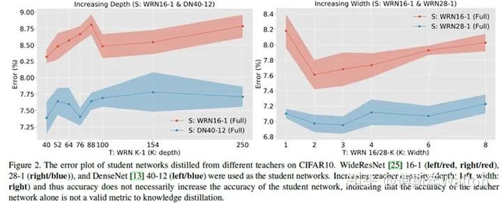 如下图,teacher网络越深,student蒸馏效果并一定提升。